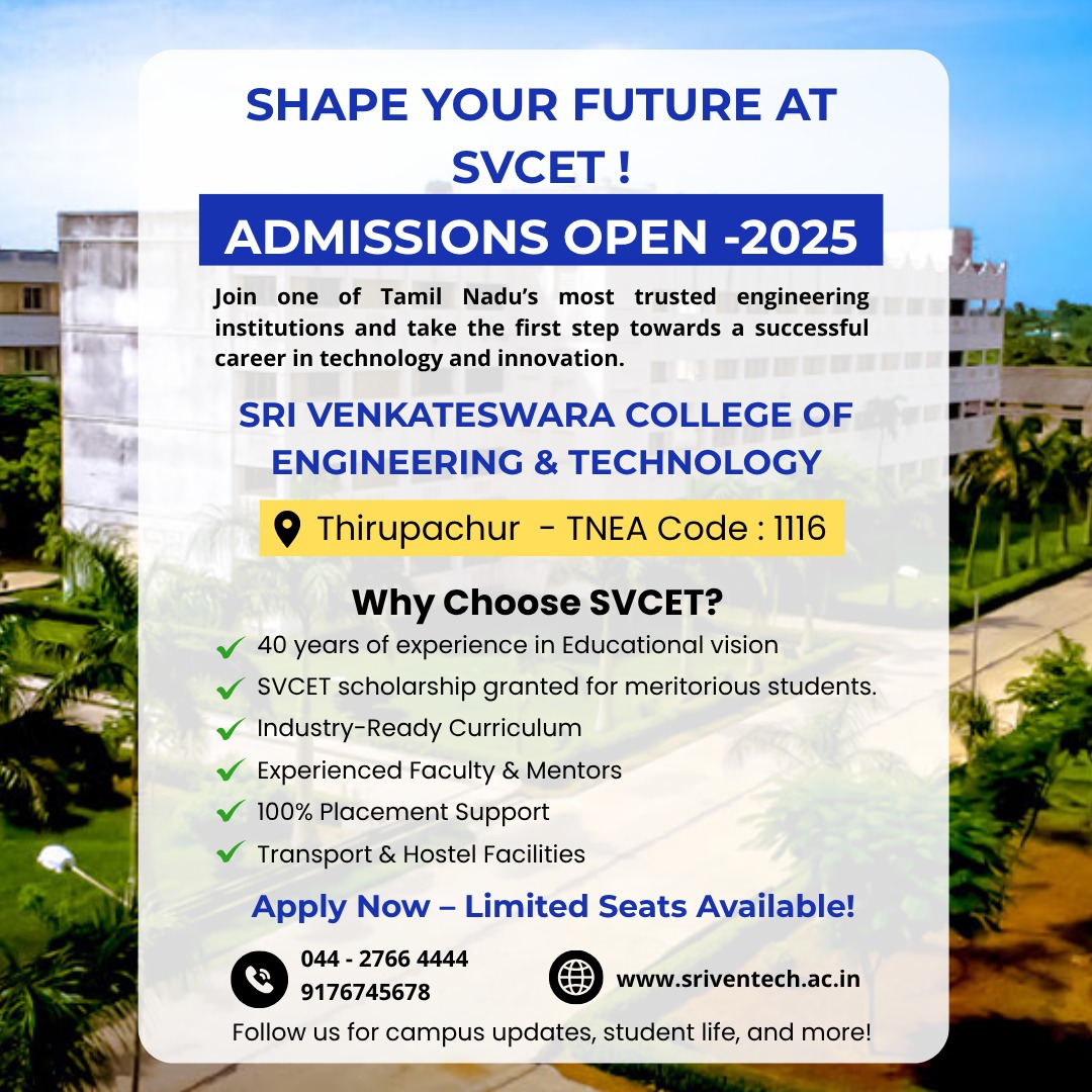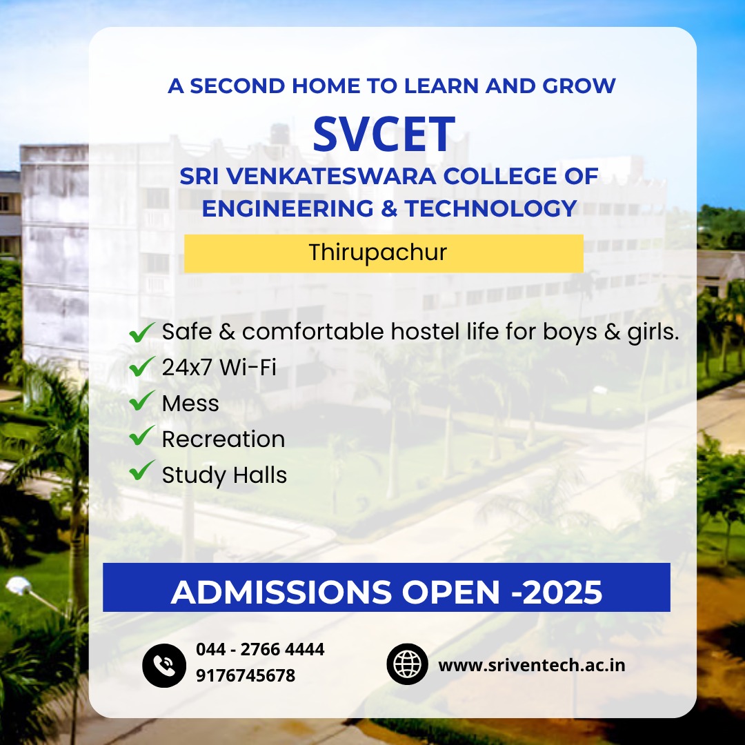 Admission Open for 2025 - 2026 UG: Computer Science and Engineering | CSE (Artificial Intelligence & Machine Learning) | CSE (Cyber Security) | Civil Engineering | Electrical and Electronics Engineering | Electronics and Communication Engineering | Mechanical Engineering | Information Technology | Artificial Intelligence & Data Science... Admission Open for 2025 - 2026 PG: Master of Business Administration (MBA) | Master of Computer Application (MCA) | M.E. Computer Science and Engineering | M.E. Power Electronics and Drives | M.E.VLSI Design.